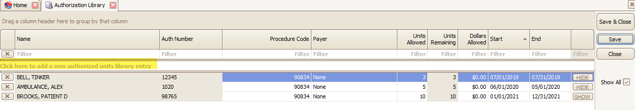Hide – Click the ‘Hide’ button if you want the data stored for archive purposes but no longer want it available for selection on claims. Click the ‘Show’ button to reverse this process. All authorizations remain visible in the Authorization Library.