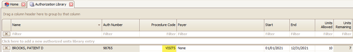 The Authorization Library allows you to track the numbers of units allowed and remaining for a procedure code. Please see Advanced Techniques for additional techniques.